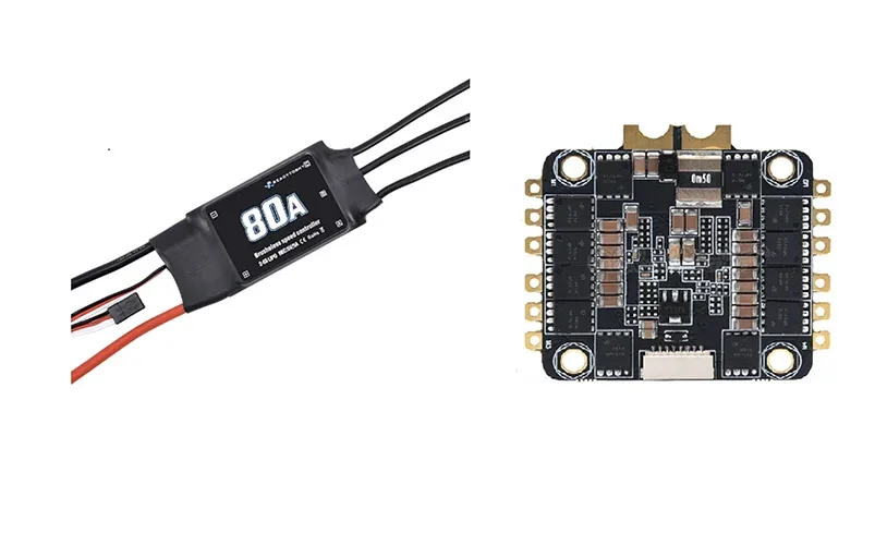 FPV drone’ların uçuş performansı üzerinde önemli bir etkiye sahip olan Elektronik Hız Kontrolcüleri (ESC‘ler), motorların hızını doğru bir şekilde düzenleyerek hassas uçuş manevralarını ve hız kontrolünü sağlar. Uçuş kontrolcüsünden aldığı sinyalleri güç sinyallerine çevirerek motorların hızlarını ayarlar, aynı zamanda motorları aşırı akım ve voltaj gibi olumsuz koşullara karşı korur. ESC (Electronic Speed Controller) iki farklı türde bulunabilir: Tekli ESC’ler ve 4’ü 1 arada ESC’ler, her ikisinin de kendine has avantajları ve dezavantajları vardır.