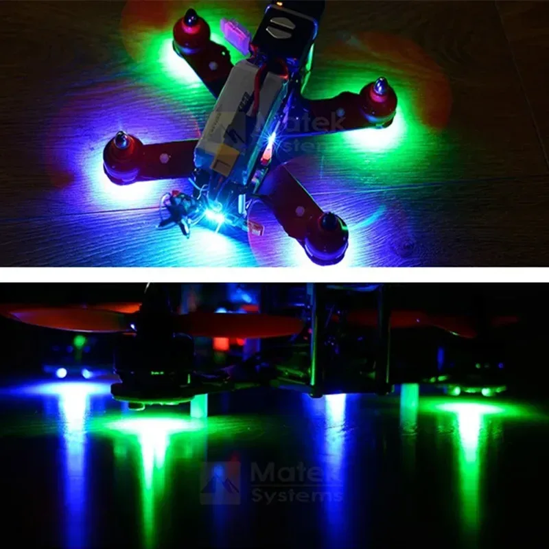 FPV dronelarda kullanılan LED ışıklar hem estetik bir amaca hizmet eder hem de özellikle düşük ışık koşullarında veya yarış sırasında dronenin görünürlüğünü artırır. Bazı durumlarda, LED ışıkların rengi ve yanıp sönme modeli, pilotun dronunu diğerlerinden ayırt etmesine yardımcı olabilir. Sadece görsellik için de kullanımı yaygındır.