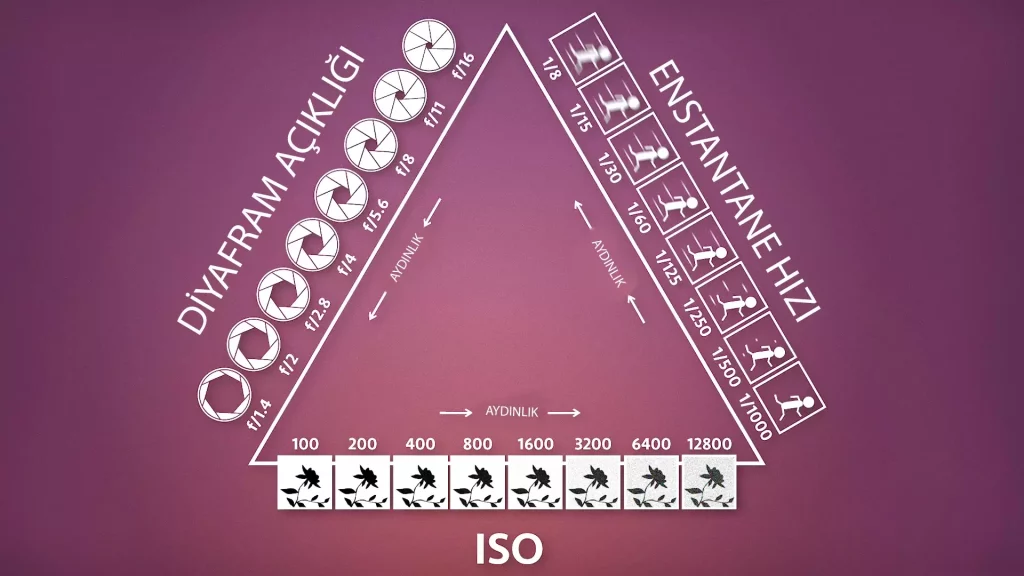 ISO, kamera sensörünün ışığa duyarlılığını belirler ve genel olarak sayısal bir değer ile ifade edilir (örn., ISO 100, ISO 400, ISO 1600).